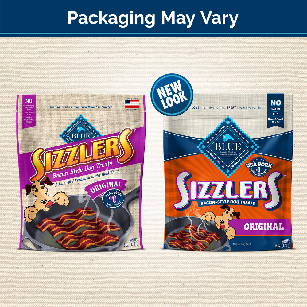 If your dog loves bacon, he'll beg for BLUE?Sizzlers, the bacon-style treat that features 100% USA pork as the first ingredient ? not wheat. These great-tasting, natural dog treats contain no red, BLUE?or yellow dyes, no BHA preservative, and no corn, wheat or soy, which some other bacon-style treats do contain.