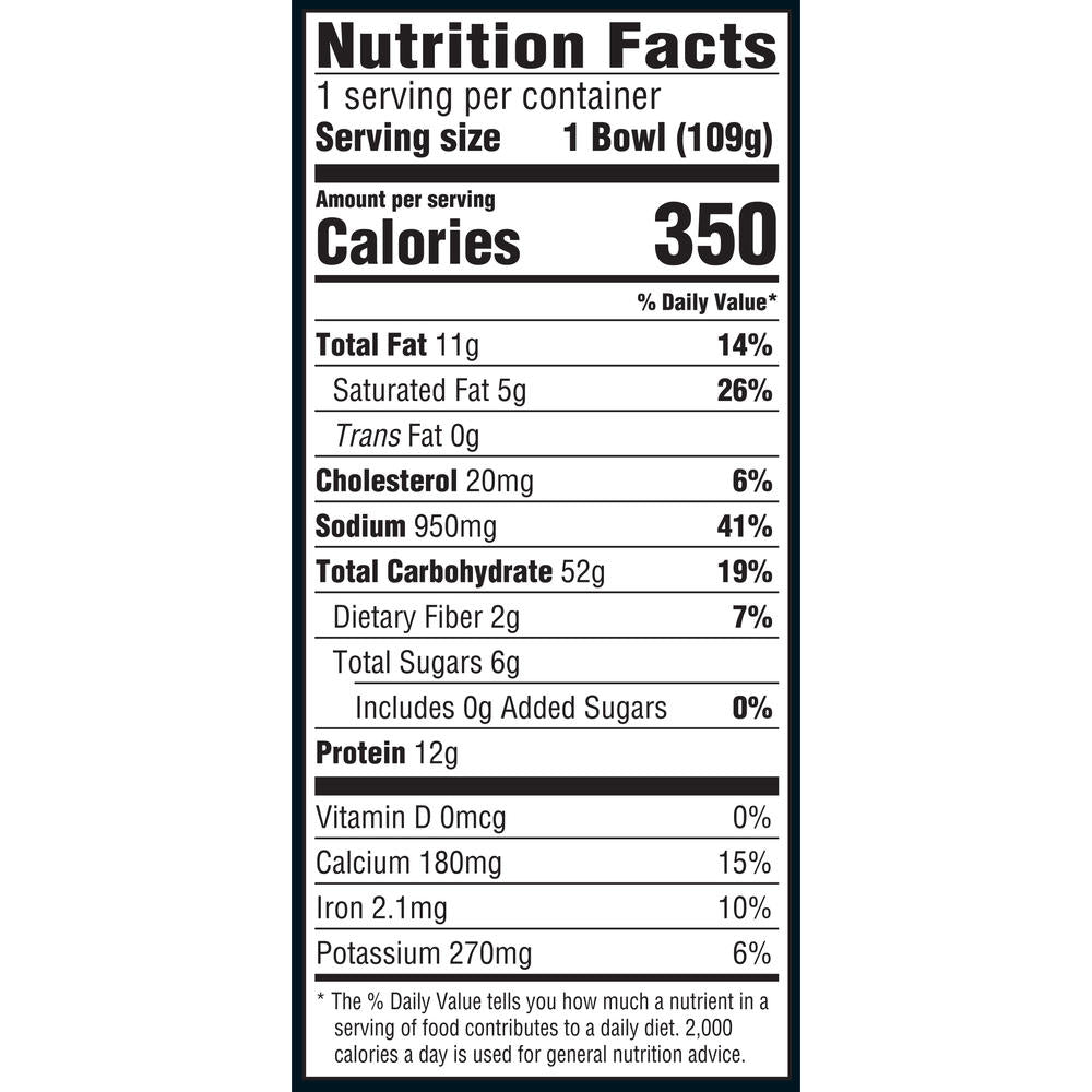 - Bowl contains pasta, cheese sauce, seasoning packet and crunchy breadcrumb topping
