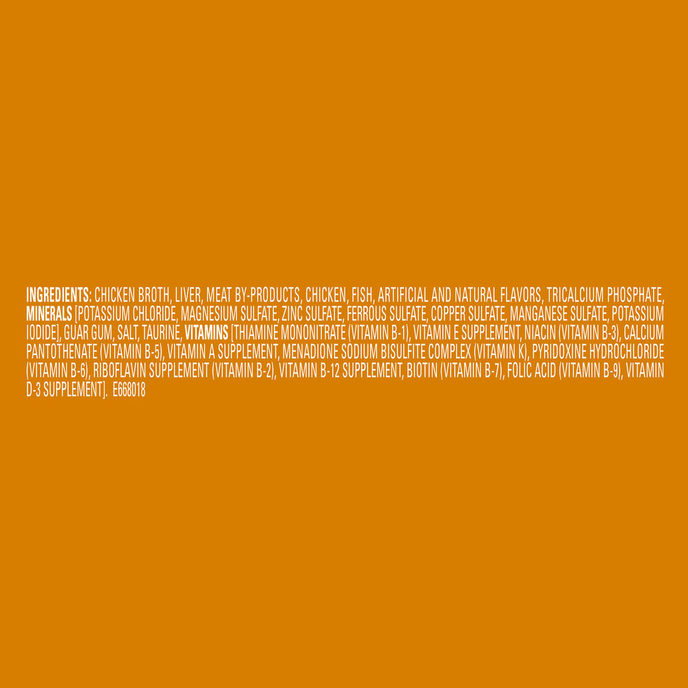- Ingredients; Liver, Meat Broth, Meat By-Products, Chicken, Artificial and Natural Flavors, Tricalcium Phosphate, Guar Gum, Potassium Chloride, Salt, Magnesium Sulfate, Taurine, Thiamine Mononitrate, Vitamin E Supplement, Zinc Sulfate, Ferrous Sulfate, Niacin, Calcium Pantothenate, Vitamin A Supplement, Copper Sulfate, Manganese Sulfate, Menadione Sodium Bisulfite Complex (Source of Vitamin K Activity), Pyridoxine Hydrochloride, Riboflavin Supplement, Vitamin B-12 Supplement, Biotin, Folic Acid, Vitamin D-3 Supplement, Potassium Iodide. C-6680.