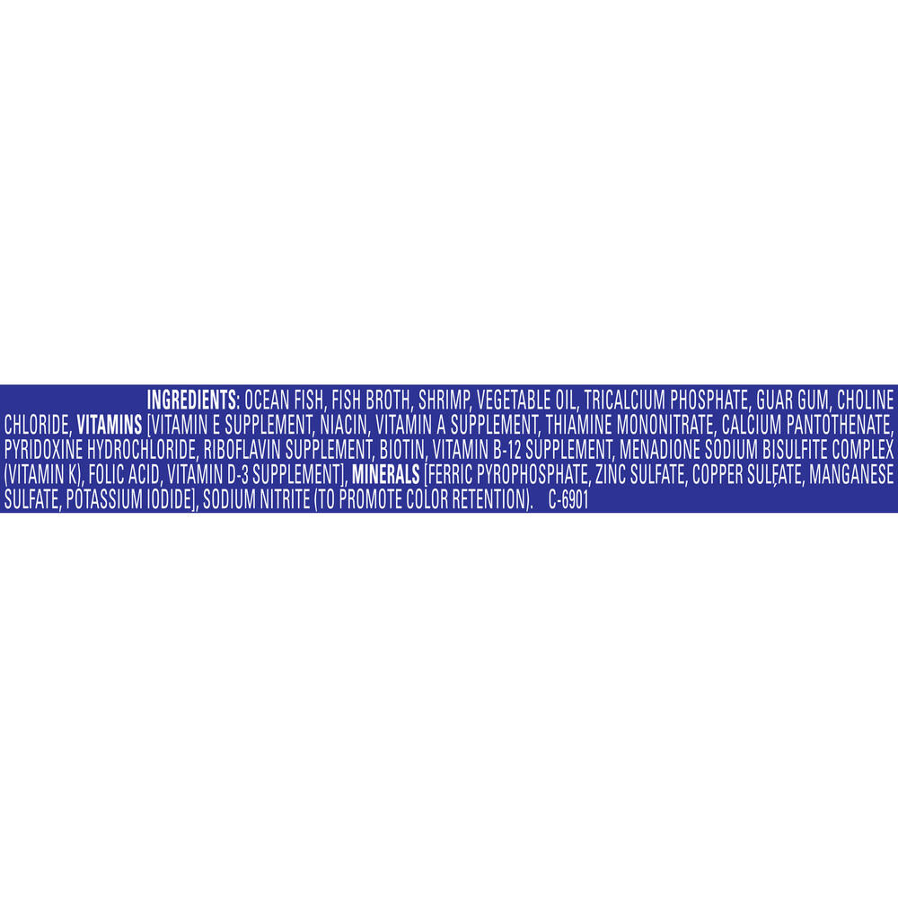 - Ingredients; Ocean Fish, Fish Broth, Shrimp, Calcium Phosphate, Vegetable Oil, Guar Gum, Vitamin E Supplement, Vitamin A Supplement, Sodium Nitrite (to Promote Color Retention), Zinc Sulfate, Thiamine Mononitrate, Manganese Sulfate, Menadione Sodium Bisulfite Complex (Source of Vitamin K Activity), Riboflavin Supplement, Folic Acid, Pyridoxine Hydrochloride, Vitamin D-3 Supplement. A-6901.