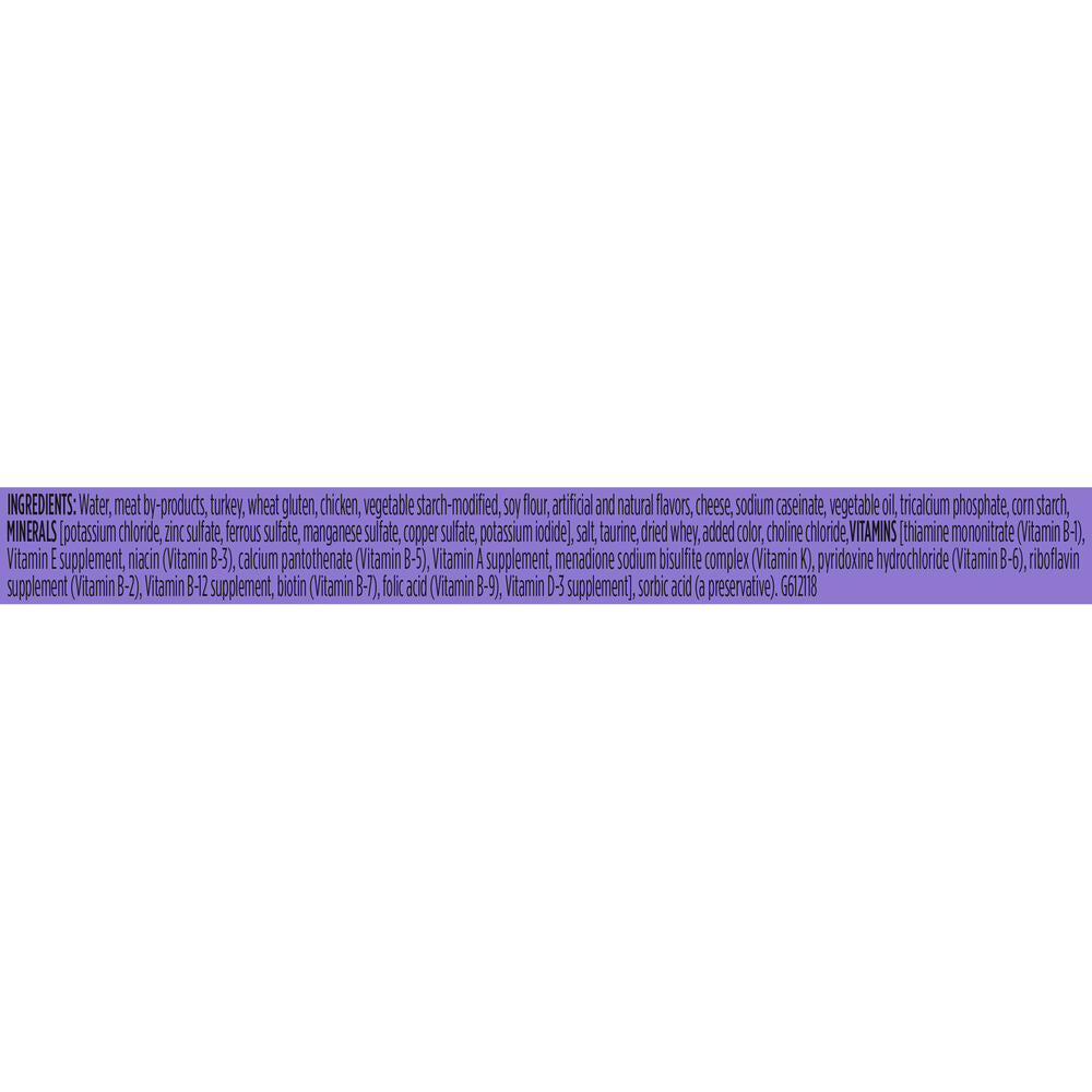 - Ingredients; Water Sufficient for Processing, Meat By-Products, Turkey, Wheat Gluten, Chicken, Corn Starch-Modified, Soy Flour, Cheese, Artificial and Natural Flavors, Tricalcium Phosphate, Soybean Oil, Potassium Chloride, Dried Egg Product, Taurine, Salt, Added Color, Whey, Sodium Caseinate, Choline Chloride, Mono and Dicalcium Phosphate, Sodium Tripolyphosphate, Thiamine Mononitrate, Vitamin E Supplement, Zinc Sulfate, Ferrous Sulfate, Sorbic Acid (a Preservative), Carrageenan, Niacin, Calcium Pantothenate, Copper Sulfate, Vitamin A Supplement, Manganese Sulfate, Menadione Sodium Bisulfite Complex (Vitamin K), Pyridoxine Hydrochloride, Riboflavin Supplement, Vitamin B-12 Supplement, Biotin, Folic Acid, Vitamin D-3 Supplement, Potassium Iodide. E-6121.