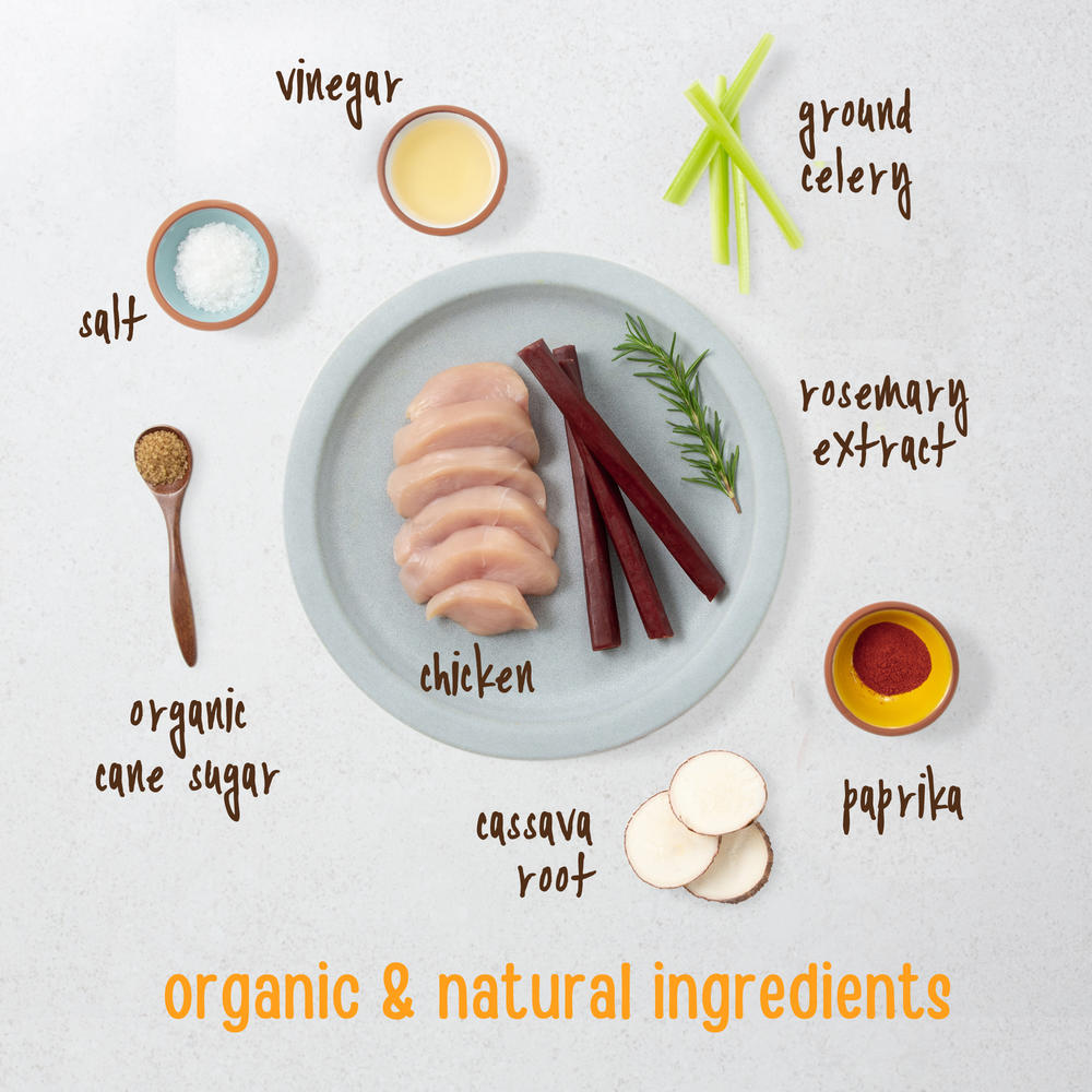 - Truth is our first ingredient. We carefully cook our natural Essential Chicken Savory Sticks in small batches using honest ingredients like real chicken, cassava root, and rosemary extract?never any by-products or waste